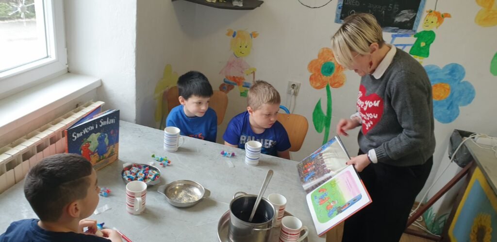 Na četvrtoj čajanki knjižničarka Milana našim prvašićima čitala je priču „Smrveni i Smlavi“ Julije Donaldson, koja ih je toliko zainteresirala da su danima ponavljali neobične riječi i pojmove. Ovo je priča o malim crvenim i plavim bićima iz svemira koji vjeruju da su potpuno različiti i zato se ne smiju međusobno družiti i miješati. Kada se Smrvenka Marijeta i Smrven Bero zaljube priča je postala zanimljivija i napetija, a prvašići sve nestrpljiviji da čuju kako su reagirale njihove obitelji i hoće li ljubav pobijediti.