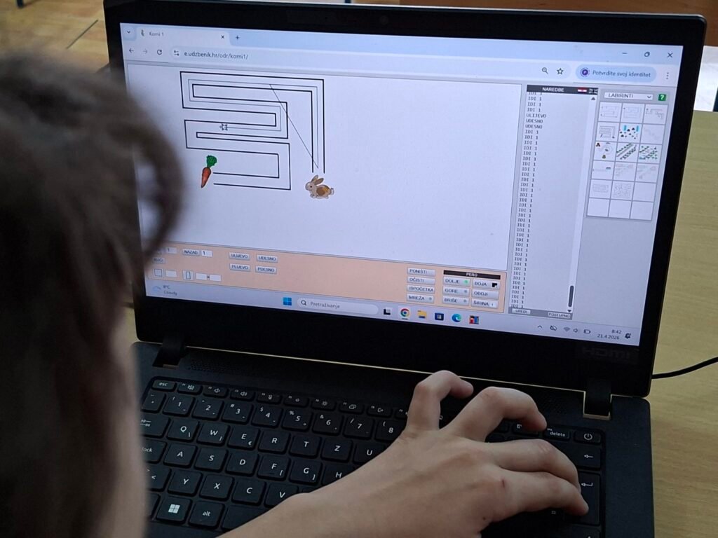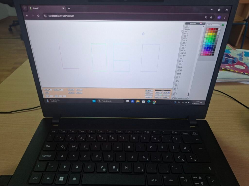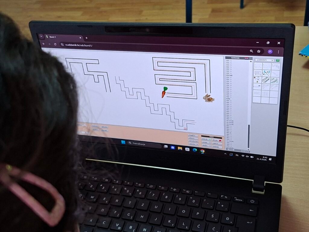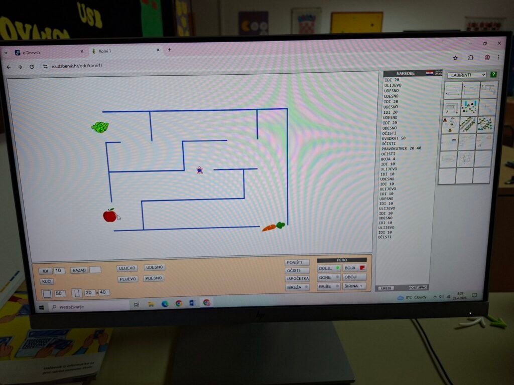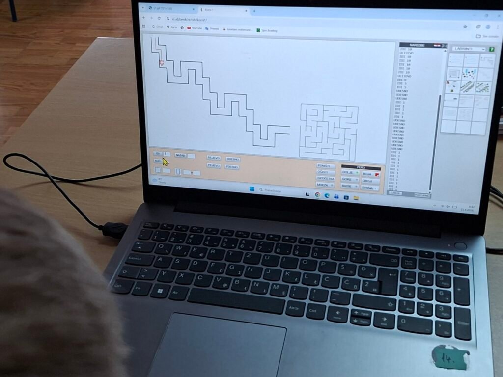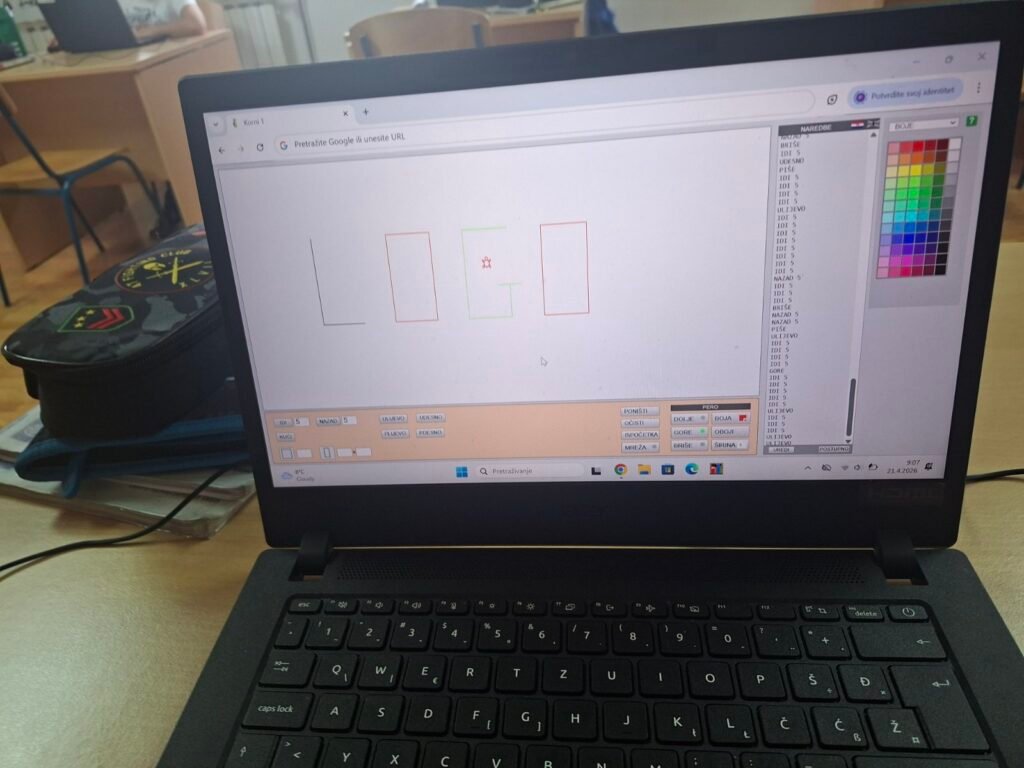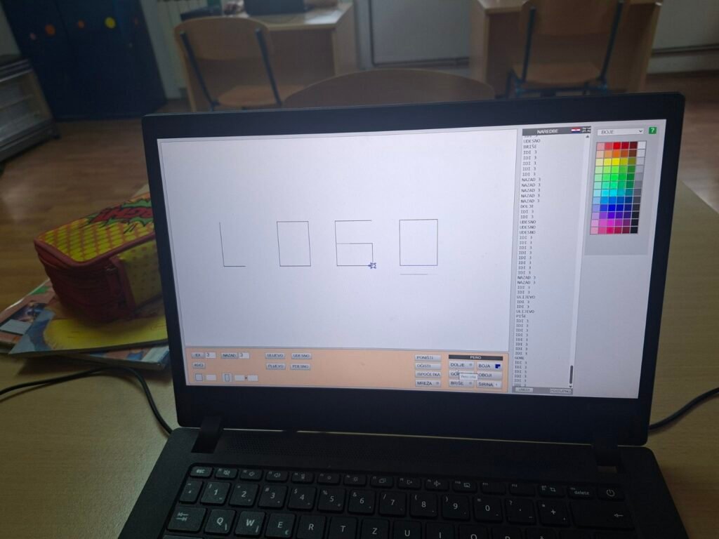 Prvo su zaronili u svijet programiranja kroz program FMS Logo — učili su osnovne naredbe poput IDI, ULIJEVO i UDESNO, crtali geometrijske oblike u različitim bojama i rješavali labirinte upisivanjem naredbi korak po korak. Svaki točan korak odmah se vidio na ekranu — pravo malo programersko zadovoljstvo!