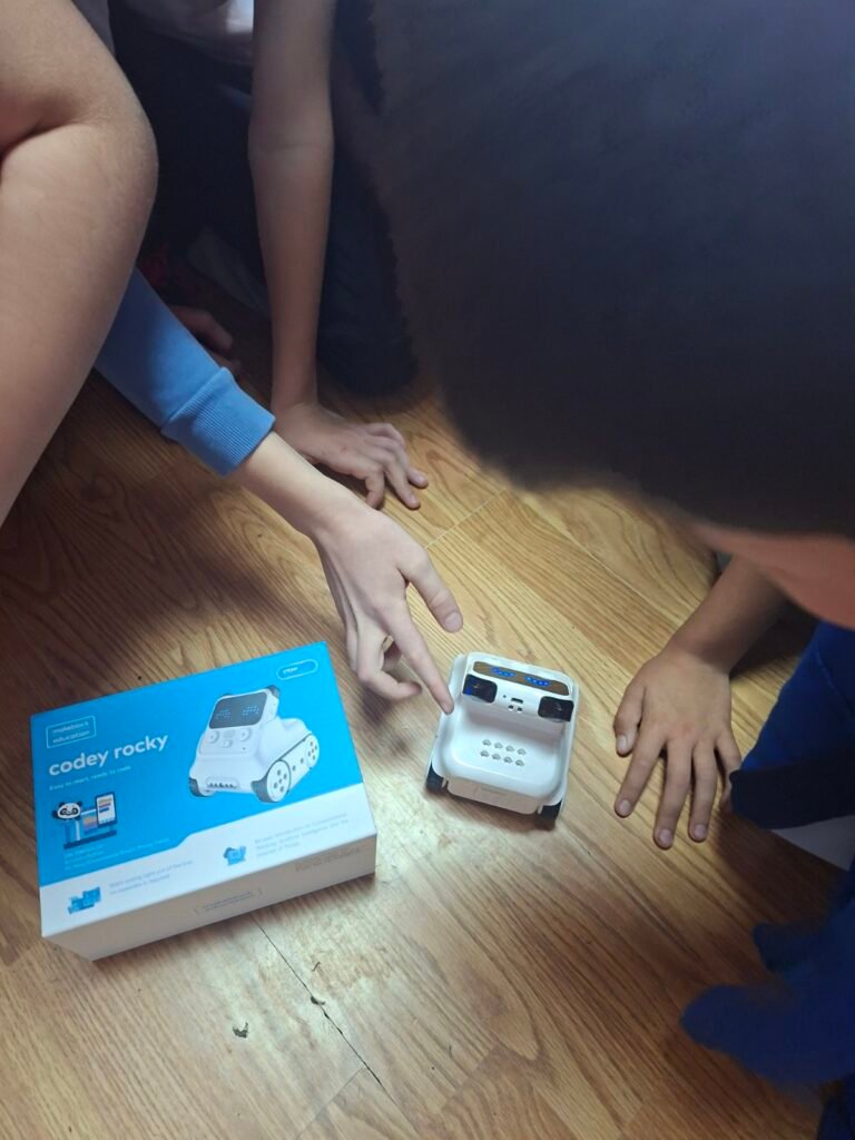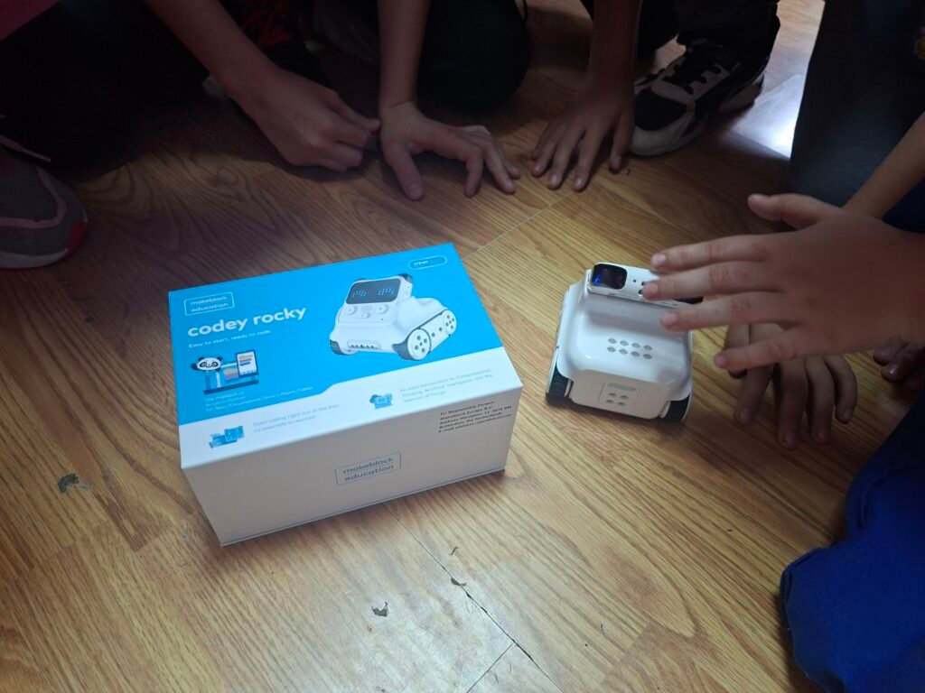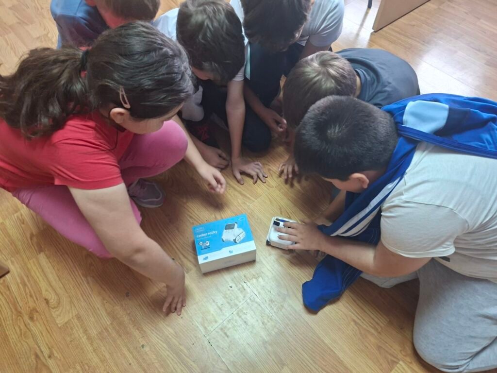A onda je stigao Codey Rocky! Učenici su se spustili na pod, okružili robota i istraživali sve što zna. Putem aplikacije Makeblock upravljali su njegovim kretanjem joystickom, mijenjali brzinu i način rada, a robot je mogao čak i izražavati emocije — smijati se, plakati i biti iznenađen. Malo tko je ostao ravnodušan kad je robot počeo pokazivati kako se osjeća!